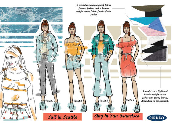 The concept for this competition was inspired by the Northwest pacific road trip, all the way from Seattle to Los Angeles. The aim was to create a collection with a product range suitable for each city on the road trip: Seattle, San Francisco and Los Angeles. Seattle focused on sailing in the sun. San Francisco was based on the music and festival scene. Los Angeles was inspired by the sunny beaches and surfing. The collections were made for women and men, who would enjoy spending time doing those activities together and travel to see new places and gain new experiences in an Old Navy style.